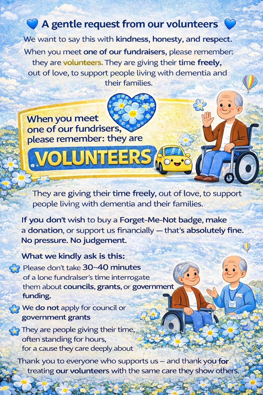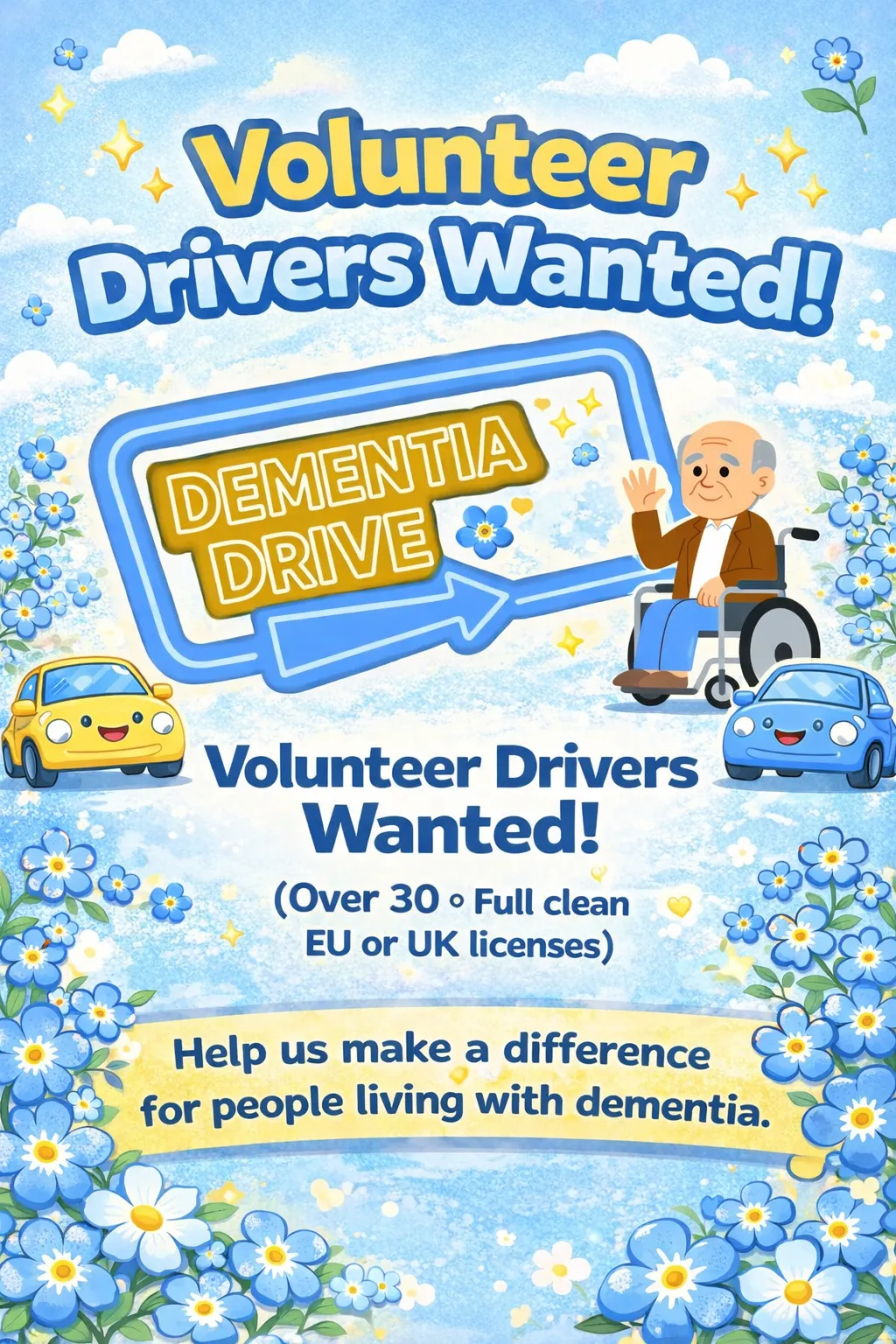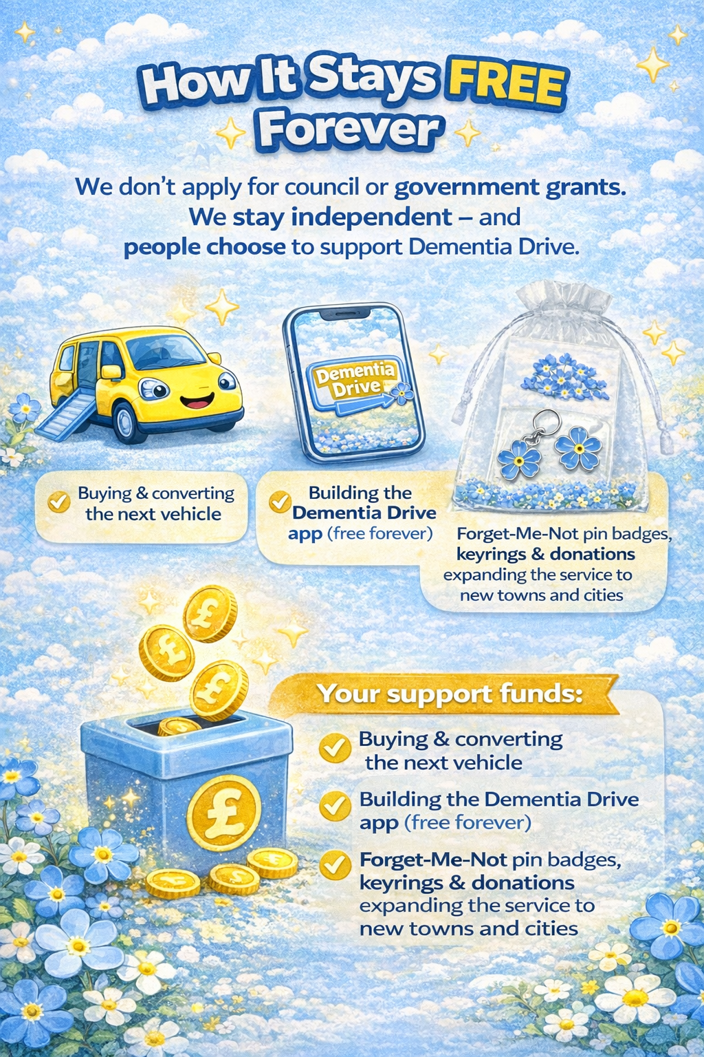 We sell our Forget-Me-Not pin badges and keyrings to those who want to support our mission. We use all that money to buy vehicles and have them adapted to assist those in need.